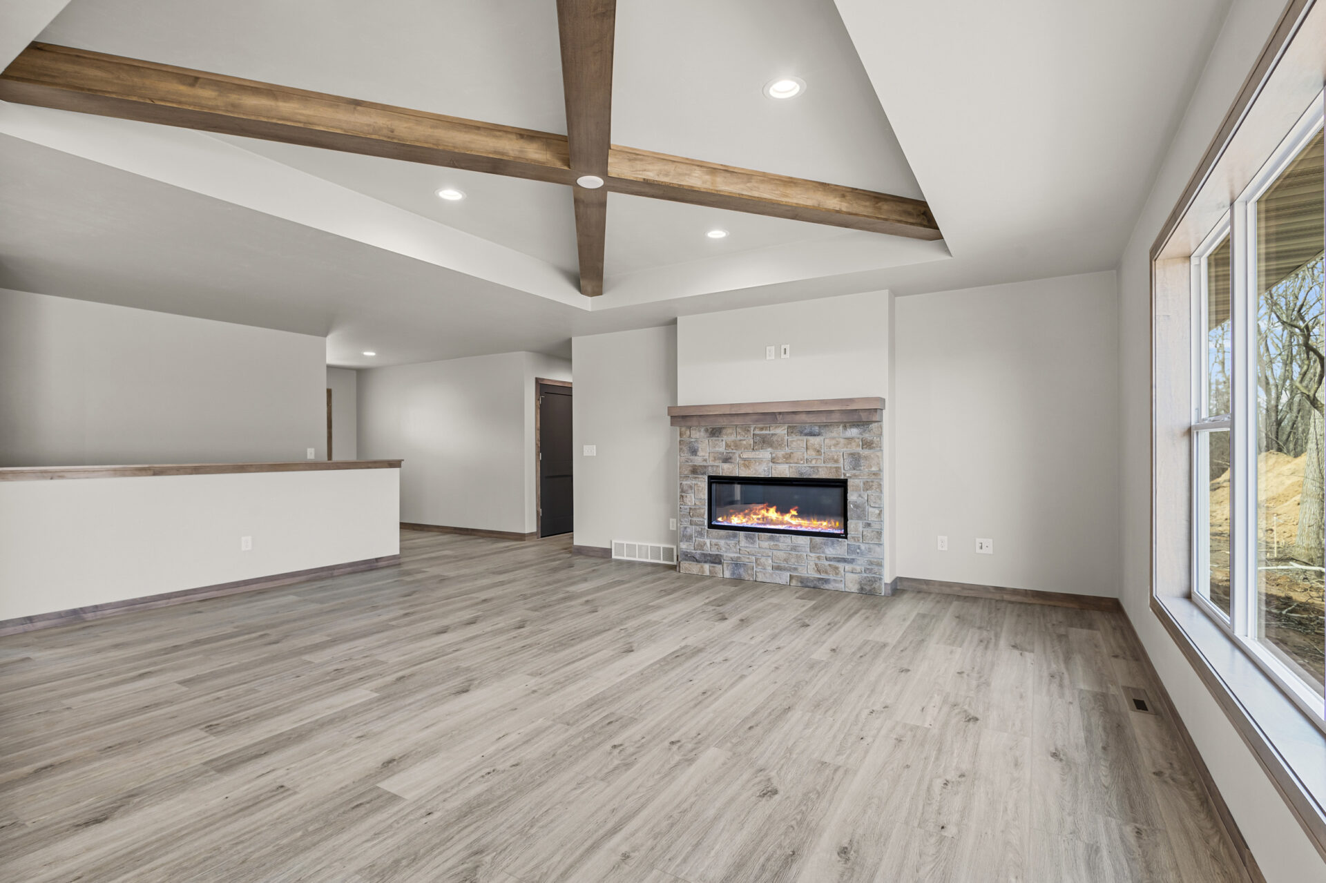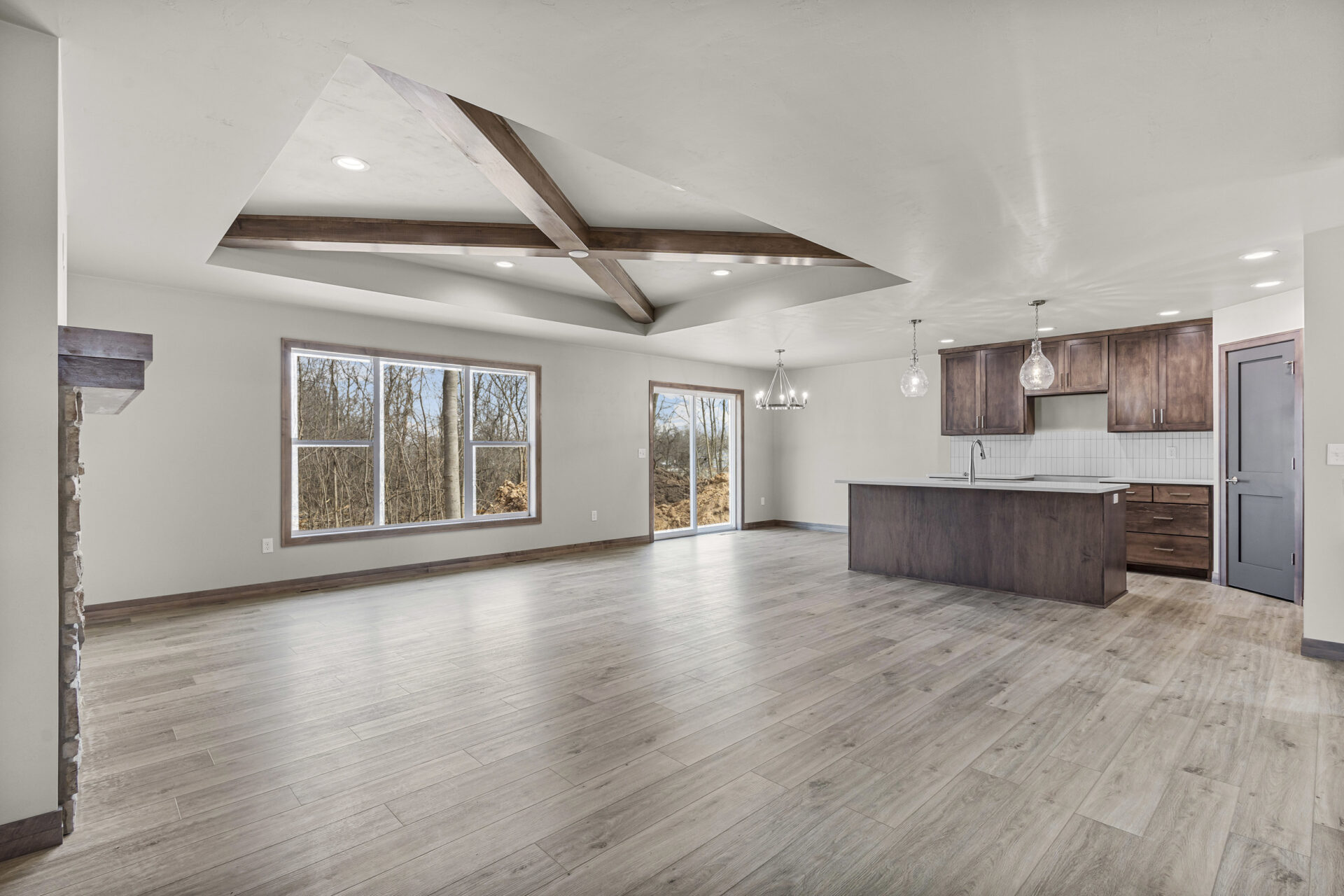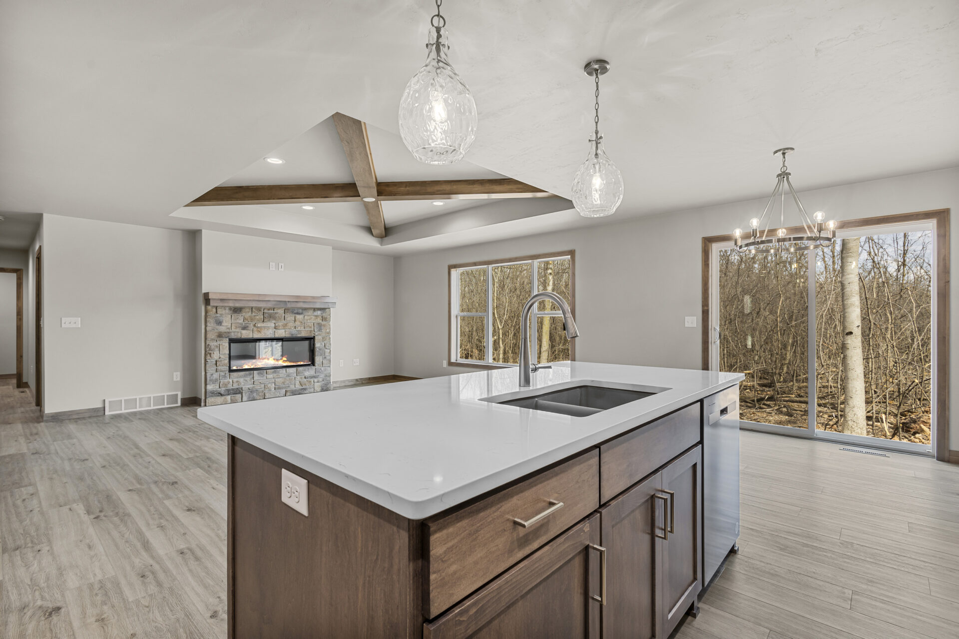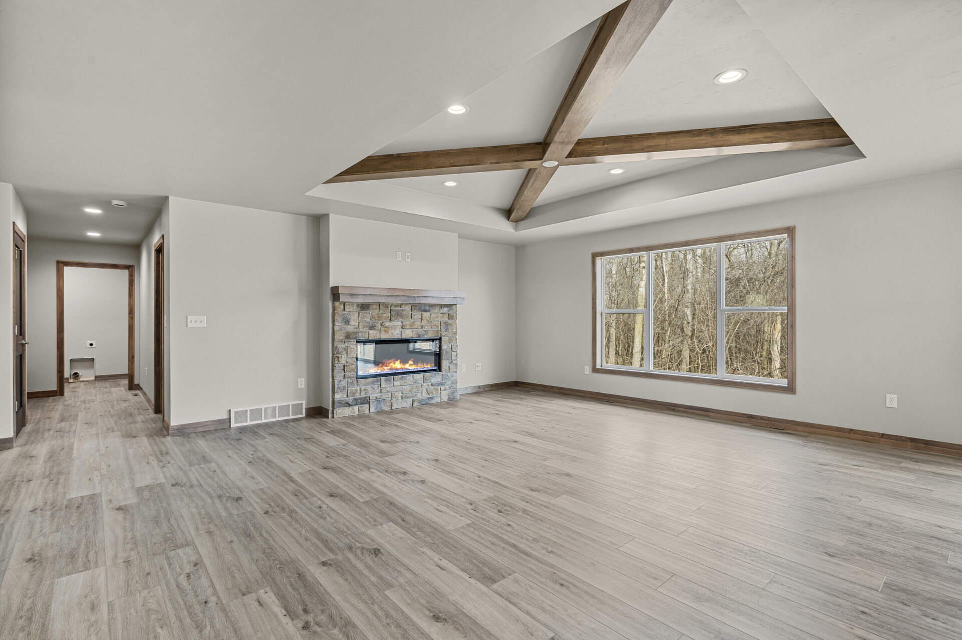 BUILT BY MEACHAM DEVELOPMENT, INC.-A FOCUS ON ENERGY CERTIFIED HOME. Country living on over 1.5 acres! Stunning 3 bed, 2 bath home! The kitchen features quartz countertops & walk-in pantry. The spacious great room features a 50" Simplifire Allusion Platinum Linear electric fireplace surrounded by beautiful stone. LVP flooring & caramel stain are found throughout main living areas. Add'l features include: split bedroom design, mud room & laundry room close to the spacious master suite. LL is stubbed for a bathroom & has an egress window for future expansion. Driveway apron is gravel. Water is a community well & there is a homeowner's association for the well, $225 quarterly or $900 for the year. Stubbed for water softener. Water softener recommended for this subdivision. PHOTOS SIMILAR TO