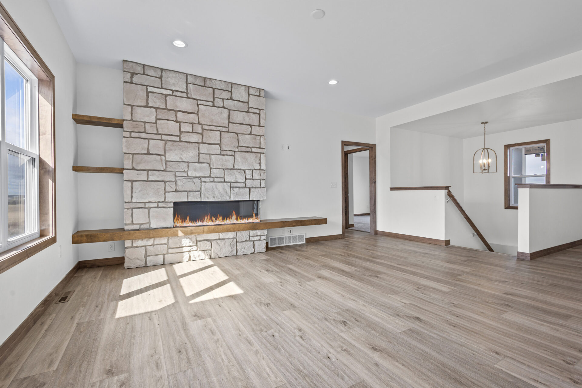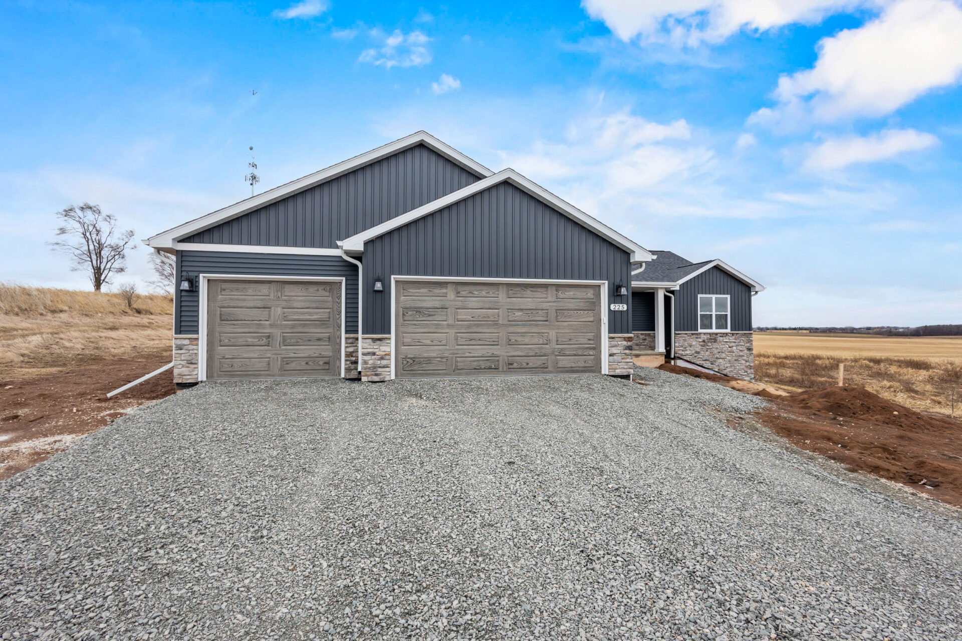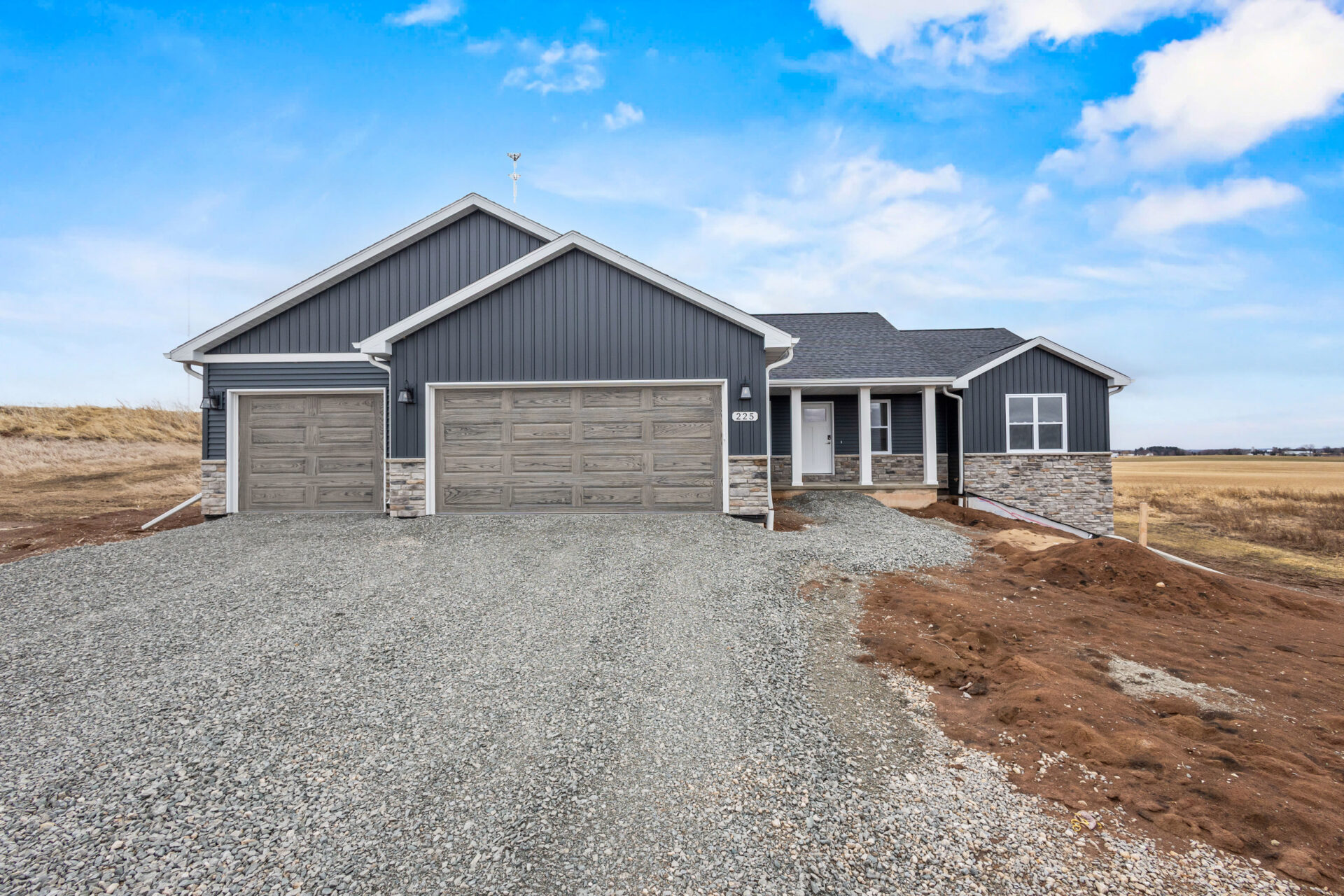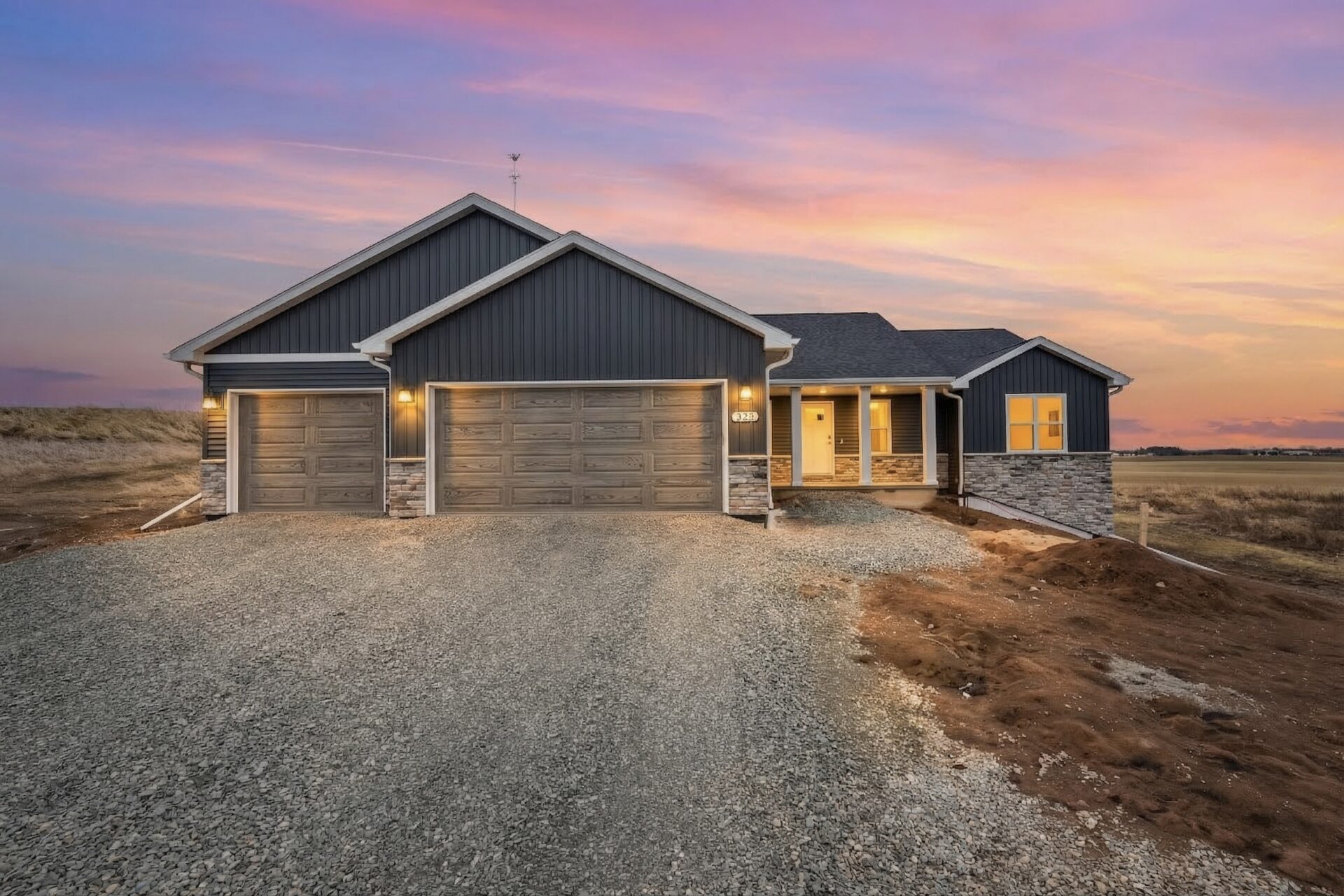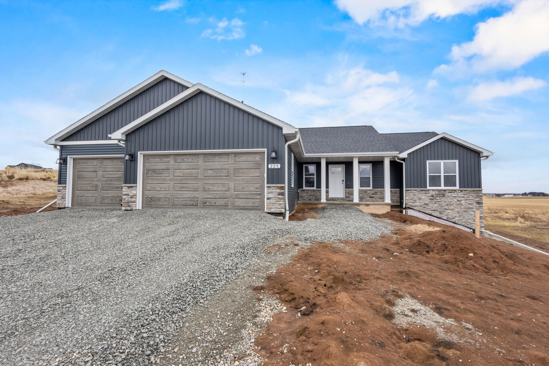 BUILT BY MEACHAM DEVELOPMENT, INC.-A FOCUS ON ENERGY CERTIFIED HOME. Step into this stunning property situated on a 1+ acre lot with unbelievable views of rolling hills. The kitchen features custom maple cabinets in Fawn stain, quartz countertops, & stunning tile backsplash. Relax next to your HH 55” Scion Trinity 3 Sided Linear Electric Fireplace surrounded from floor to ceiling with Niveo Volterra stone. A custom bench & shelving make this space complete! The primary suite is a private retreat. Unfinished LL HAS 9' CEILINGS is stubbed for a bathroom & FULL WALK-OUT for future expansion. Driveway apron is gravel. Water isa community well & there is a homeowner's association for the well. Stubbed for water softener. Water softener is recommended for this subdivision.